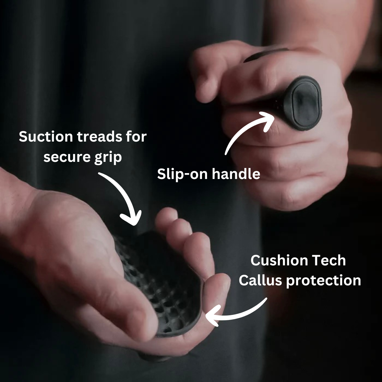 Grip Max slips between your fingers, covering your callus area for support, while its suction-like treads lock onto equipment for a secure, non-slip grip.
